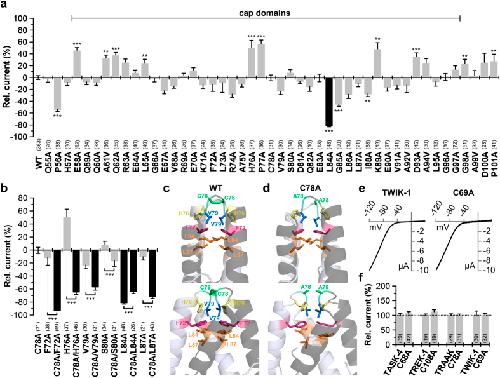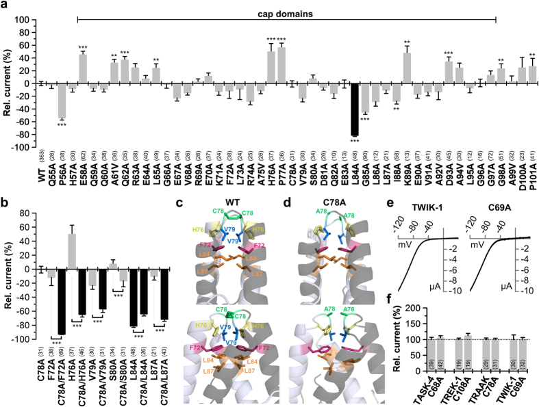 Figure 7. Alanine scan through the extracellular M1-P1 linker of human TRAAK.(a) Relative current amplitudes at +40âmV compared to TRAAK wild-type (WT). Mutations in the cap exhibiting a pronounced current amplitude reduction are highlighted in black. Note that the C78A mutation at the tip of the cap structure did not affect current amplitudes. (b) TRAAK mutations at the sites homologous to the TASK-1 âhitsâ were functionally studied in TRAAK alone (as in (a)) or in the absence of the cysteine at position 78 (C78A). F72 in TRAAK corresponds to L48 in TASK-1, H76 to Y52, C78 to N53, V79 to L54, S80 to S55, L84 to Y59 and L87 to L62. Pronounced reduction in current amplitudes compared to the C78A mutant alone are illustrated in black. (c) Domain-swapped TRAAK cap structure after 10âns of MD simulation illustrating the relevant residues identified in (b). Upper panel shows the orientation as in Brohawn et al., 2012 and the lower panel is rotated by 90°. (d) Domain-swapped TRAAK cap structure of the C78A mutation after 10âns of MD simulation, illustrating the relevant residues identified in (b). Upper panel shows the orientation as in Brohawn et al., 2012 and the lower panel is rotated by 90°. (e) Representative current traces of TWIK-1 and TWIK-1 C69A recorded in oocytes, using a voltage ramp from â120 to +40âmV. (f) Changes in relative current amplitudes at +40âmV, after mutating the conserved cysteine residues in the cap structure of different K2P channels. (a,b,f) **pâ<â0.01; ***pâ<â0.001. Significance was probed using unpaired Studentâs T-Test against the respective wild-type channel, unless for panel (b), here significance of the double mutation was probed against the respective single mutation without C78A. Data are presented as Meanâ±âSEM. The number of experiments are given above the construct name or included in the bar graphs.