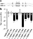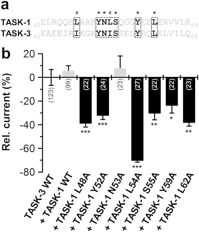 Figure 4. Co-expression of TASK-1 ‘hits’ from the alanine scan with TASK-3.(a) Sequence alignment of the tip of the TASK-1 and TASK-3 cap. TASK-1 ‘hits’ are highlighted in bold. *conserved residues; #conservative amino acids. (b) TASK-3 was injected in Xenopus oocytes alone (TASK-3 WT), in the presence of TASK-1 WT or in presence of TASK-1 mutants. Changes in current amplitudes compared to TASK-3 WT were analyzed at +40 mV. *p < 0.05; **p < 0.01; ***p < 0.001. Unpaired Student’s T-Test. Significance was probed against TASK-3 WT. Data are presented as Mean ± SEM. The number of experiments are included in the bar graphs.