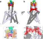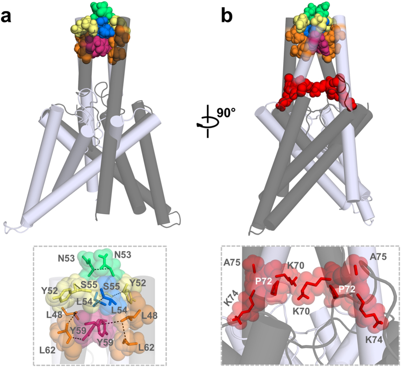 Figure 6. Hydrophobic interactions stabilize the tip of the TASK-1 cap structure.TASK-1 ‘hits’ identified in the alanine scan are highlighted in the TASK-1 homology model based on the domain-swapped TREK-2, following a 100 ns MD simulation. The two different subunits are shown in gray and light gray. (a) Residues stabilizing the tip of the cap structure are shown in space fill mode and a zoom-in is provided at the bottom. (b) 90° rotation of the model. Mutations resulting in a loss of ‘conductivity’ are illustrated in red space fill and a zoom-in showing these residues located in the EIP is provided at the bottom.