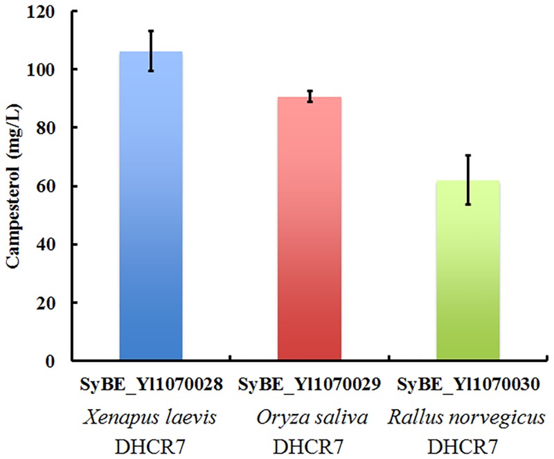 Fig 2. Campesterol production in strains with DHCR7 from different species.Y. lipolytica strains with DHCR7 from X. laevis, O. saliva and R. norvegicus were named as SyBE_Yl1070028, SyBE_Yl1070029 and SyBE_Yl1070030 respectively. The amount of campesterol produced by these three strains was measured after 120 h shake flask culture in YPD medium.