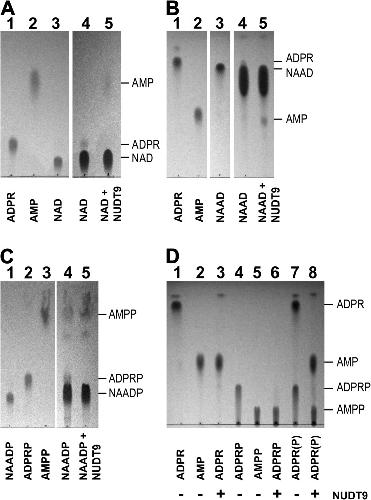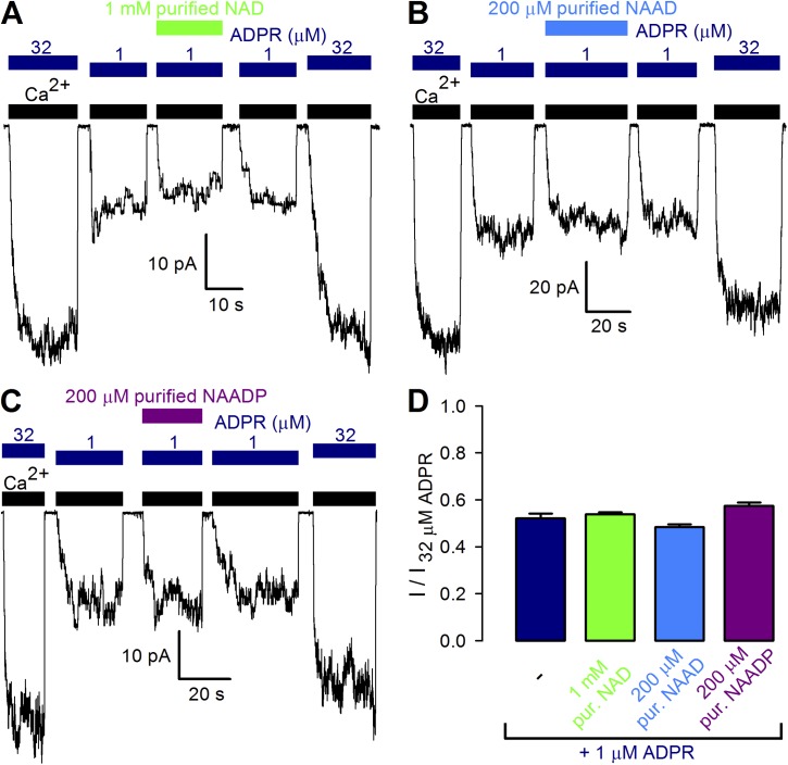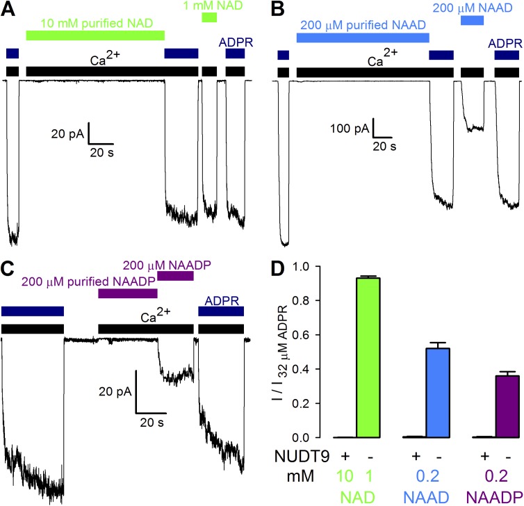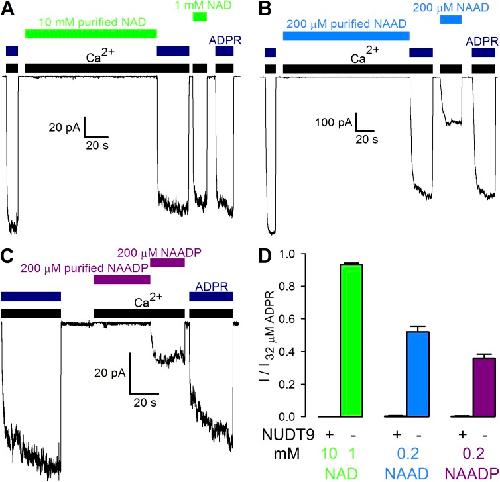 Transient receptor potential melastatin 2 (TRPM2), a Ca(2+)-permeable cation channel implicated in postischemic neuronal cell death, leukocyte activation, and insulin secretion, is activated by intracellular ADP ribose (ADPR). In addition, the pyridine dinucleotides nicotinamide-adenine-dinucleotide (NAD), nicotinic acid-adenine-dinucleotide (NAAD), and NAAD-2'-phosphate (NAADP) have been shown to activate TRPM2, or to enhance its activation by ADPR, when dialyzed into cells. The precise subset of nucleotides that act directly on the TRPM2 protein, however, is unknown. Here, we use a heterologously expressed, affinity-purified-specific ADPR hydrolase to purify commercial preparations of pyridine dinucleotides from substantial contaminations by ADPR or ADPR-2'-phosphate (ADPRP). Direct application of purified NAD, NAAD, or NAADP to the cytosolic face of TRPM2 channels in inside-out patches demonstrated that none of them stimulates gating, or affects channel activation by ADPR, indicating that none of these dinucleotides directly binds to TRPM2. Instead, our experiments identify for the first time ADPRP as a true direct TRPM2 agonist of potential biological interest.