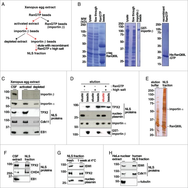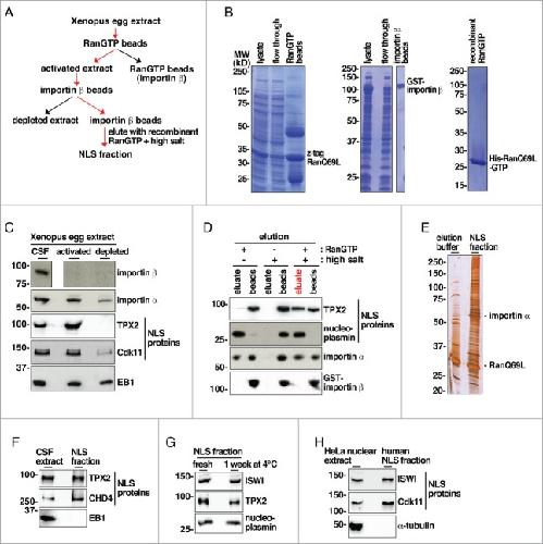 Figure 1. NLS purification method. (A) Purification strategy. Xenopus egg extract, either CSF or interphase, is incubated with z-tag RanQ69L (RanGTP) beads. Endogenous importin β binds to the beads. The activated extract, containing free NLS proteins, is incubated with GST-fused importin β beads. The proteins bind to the beads either directly or via endogenous importin α. NLS proteins are eluted from the beads by recombinant His-RanQ69L-GTP (RanGTP) in the presence of 0.5 M NaCl. (B) Coomassie staining of the affinity beads and recombinant RanGTP required for the NLS purification. (C) Extract after bead treatment. Each extract defined in Fig. 1A is immunoblotted. Importin β is depleted from the activated extract and NLS proteins are depleted from the depleted extract. EB1, a microtubule regulator without NLS, is not depleted and serves as a control. (D) Elution of NLS proteins in the presence or absence of 20 μM RanGTP and 0.5 M NaCl. Immunoblots were done for eluate and beads after elution. Note that RanGTP efficiently elutes some NLS proteins such as nucleoplasmin but others such as TPX2 only in the presence of high salt. (E) Elution buffer containing 20 μM RanGTP and 0.5 M NaCl, and eluate containing additionally NLS proteins and importin α. (F) The recovery of NLS proteins from Xenopus egg extract. From 5 ml CSF extract, 3.75 ml NLS fraction was obtained. 0.5 μl CSF extract and 5 μl NLS fraction were analyzed by SDS-PAGE and Western blot. The recovery of NLS proteins was quantified from the gels (TPX2, 16 ± 8%, n = 4; CHD4, 12 ± 7%, n = 3; ISWI, 29 ± 14%, n = 3; nucleoplasmin, 4 ± 1%, n = 4). Importantly, a cytoplasmic protein EB1 was not included in the NLS fraction (recovery 0 ± 0%, n = 3). Errors represent SD from the indicated number of independent experiments. (G) The Xenopus NLS fraction was kept at 4°C for 1 week and immunoblotted for NLS proteins. The level of the tested proteins was not affected after 1 week. (H) Purification of human NLS proteins. 5 ml HeLa nuclear extract (from ∼1.5 x 109 cells) produced 0.75 ml NLS fraction. 5 μl of the extract and NLS fraction were immunoblotted. The recovery of NLS proteins was quantified (ISWI, 24 ± 8%, n = 3; Cdk11, 65 ± 22%, n = 3; TPX2, 18 ± 9%, n = 4; MTA2, 6 ± 2%, n = 3). α-tubulin, a cytoplasmic protein contaminated in HeLa nuclear extracts, was not recovered in the NLS fraction (0 ± 0%, n = 3). Errors represent SD from the indicated number of experiments.