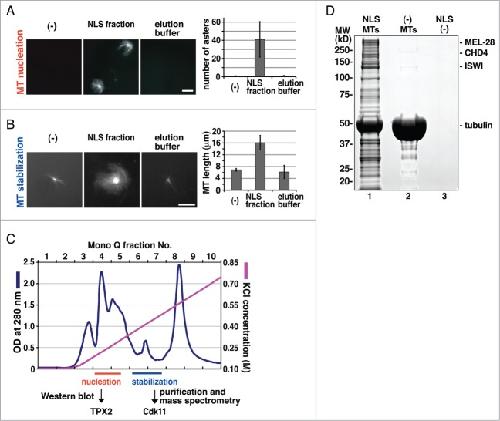 Figure 2. The pure NLS fraction is valuable to investigate the mechanisms of spindle assembly and function. (A) Microtubule (MT) nucleation induced by the NLS fraction. The Xenopus NLS fraction or elution buffer was concentrated ∼10 times and dialyzed to the dialysis buffer. The fractions were incubated in the depleted extract containing Cy3-labeld tubulin, and fixed on coverslips. Number of asters was counted in 10 randomly selected fields with 40x objective. Error bars, SD from 3 independent experiments. Scale bar, 20 μm. (B) MT stabilization induced by the NLS fraction. The concentrated, dialyzed fractions were incubated in the depleted extract containing centrosomes, Cy3-tubulin, and anti-TPX2 antibody that inhibits the MT nucleation shown in A. Samples were fixed, spun down on coverslips, and mounted. MT length of centrosomal asters was quantified.8 Error bars, SD from >20 asters. n > 3 experiments. Scale bar, 20 μm. (C) The Xenopus NLS fraction was applied to Mono Q column and eluted with the salt gradient. Each fraction was dialyzed and tested as in A, showing MT nucleation activity in fraction No. 4 and 5. Western blot showed the peak of TPX2 also in the No. 4 and 5. Each fraction was tested as in B, showing MT stabilization activity in fraction No. 6 and 7. Further purification of the activity and subsequent mass spectrometry identified Cdk11.8 (D) Microtubule-associated protein (MAP) preparation from the NLS fraction. The Xenopus NLS fraction was incubated with or without taxol-stabilized pure MTs. MAPs were eluted from the MTs with high salt (0.5 M NaCl), and were analyzed by SDS-PAGE and Coomassie staining. Mass spectrometry identified new spindle assembly factors (MEL-28 and CHD4) and maintenance factor (ISWI) in the first lane.