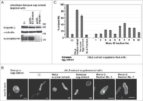 Figure 3. The NLS fractions promote NE formation. (A) Interphase Xenopus high-speed egg extracts were treated with ΔIBB-importin α or ΔIBB-ED mutant beads, and analyzed by Western blot. Nucleoplasmin (one of the most abundant NLS proteins in egg extracts) was depleted efficiently by ΔIBB-importin α but not by the ΔIBB-ED mutant. The levels of importin β and α-tubulin were unaffected. (−): no bead treatment. Note that we used ΔIBB-importin α to deplete NLS proteins but not importin β which is also important for NE assembly.30 (B) NE assembly is inhibited by the NLS depletion and is restored by addition of 1:10 volume of a rich source of importin α binding proteins (HeLa nuclear extracts, Xenopus high-speed egg extracts or the Mono Q Xenopus NLS fractions 6 and 7 (Fig. 2C)). Non-treated egg extracts were used as a control. Nuclei were analyzed by membrane staining (DiIC18). Scale bars, 10 μm. (C) Quantification of the inhibition and restoration of the NE formation. More than 100 randomly chosen chromatin substrates were measured for closed NE and normalized to the control. NE assembly is inhibited by the NLS depletion and is restored by addition of 1:10 volume of HeLa nuclear extracts and Xenopus high-speed egg extracts. The purified Xenopus NLS fraction did not restore the NE assembly probably because it is not enough concentrated. On the other hand, addition of the Mono Q fractions 6 and 7 significantly restored the NE assembly. Error bars represent SD from 3 different experiments.