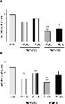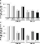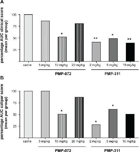 Figure 5. Dose-response study of PMP-311 and PMP-072 on clinical arthritis and paw swelling in murine collagen-induced arthritis.Mice were treated daily with PMP-311 (2, 5, 10 mg/kg, n = 15), PMP-072 (5, 10, 20 mg/kg, n = 15) or saline (n = 15) by oral gavage from day 20 until day 34. Percentages of areas under the curve (AUC) are shown. A, AUC of the clinical score was decreased more pronounced in PMP-311-treated mice versus control mice than in mice treated with PMP-072. B, Paw swelling was decreased in mice treated with PMP-311 at doses of 2 and 5 mg/kg and in mice treated with PMP-072 at 10 mg/kg. * P < 0.05 and ** P < 0.01 compared to saline treated mice.