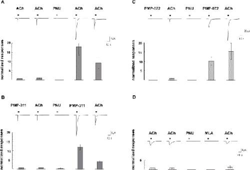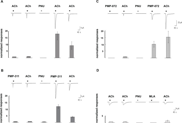 Figure 7. Differential effects of PMP-311 and PMP-072 on human α7 nAChR in the resting state and following priming with the positive allosteric modulator PNU-120596.A, Initial responses to applications of 60 μM ACh (indicated by the bars) were obtained and then the α7-expressing cells were given a priming application of 300 μM PNU-120596 for 60 s (indicated by the bars over the third trace). No ion channel current was stimulated during the PNU-120596 application but subsequent responses to ACh were greatly increased in amplitude and duration. Note that 60 μM ACh was used for the control responses in this experiment since the effects of PNU-120596 priming on 300 μM ACh-evoked responses often resulted in responses that were too large to record under voltage-clamp conditions. B, Initial responses of α7 nAChR-expressing cells to applications of 60 μM ACh and 1 μM PMP-311 before and after priming with PNU-120596 (third trace). C, Initial responses of α7 nAChR-expressing cells to applications of 60 μM ACh and 10 μM PMP-072 before and after priming with PNU-120596 (third trace). D, Initial responses of α7 nAChR-expressing cells to applications of 60 μM ACh and the effect of an application of 10 μM methyllycaconitine (MLA) after priming with PNU-120596. In each panel five sequential 210 intervals of data are shown which were separated by 30s of additional wash (not shown). The bar graphs in each panel represent the average peak current responses of at least four oocytes (±SEM), normalized to the peak current of an initial 60 μM ACh-evoked response.