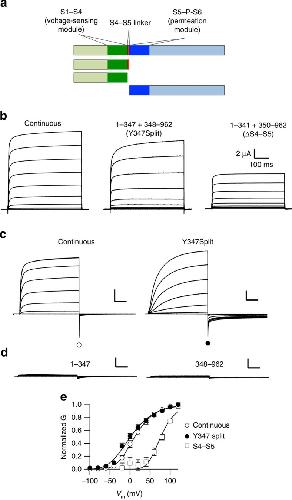 Voltage-gated channels open paths for ion permeation upon changes in membrane potential, but how voltage changes are coupled to gating is not entirely understood. Two modules can be recognized in voltage-gated potassium channels, one responsible for voltage sensing (transmembrane segments S1 to S4), the other for permeation (S5 and S6). It is generally assumed that the conversion of a conformational change in the voltage sensor into channel gating occurs through the intracellular S4-S5 linker that provides physical continuity between the two regions. Using the pathophysiologically relevant KCNH family, we show that truncated proteins interrupted at, or lacking the S4-S5 linker produce voltage-gated channels in a heterologous model that recapitulate both the voltage-sensing and permeation properties of the complete protein. These observations indicate that voltage sensing by the S4 segment is transduced to the channel gate in the absence of physical continuity between the modules.