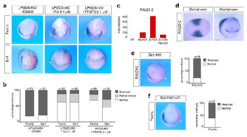 Figure 4. Retinoic acid signaling regulates placode formation(a) Treatment at stage 11 of LPGDS-depleted embryos (LPGDS-MO) with 0.1 μM RA or with the RA receptor agonist, TTNPB, restored completely or partially Foxi1c and Six1 expression on the injected side. Frontal views, dorsal to top. Injected side is indicated by the lineage tracer (Red-Gal). Double arrowheads indicate Foxi1c or Six1 expansion on the control side. (b) Quantification of the rescue experiment. Four independent experiments were performed. The number of embryos analyzed for each condition (n) is indicated on the top of each bar. DMSO vs. RA or TTNPB treated embryos (p< 0.001, Fisher exact test) RA vs. TTNPB treated embryos show no significant differences. (c) Fold induction of RALDH2 from the microarray data. (d) By in situ hybridization RALDH2 is detected in the trunk mesoderm (dorsal view, anterior to right) and at the anterior neural plate (frontal view; arrowheads). (e) RALDH2 expression is lost in Zic1-depleted embryos. The graph is a quantification of the results. Three independent experiments were performed. The number of embryos analyzed (n) is indicated on the top of each bar. (f) Foxi1c expression is reduced in RALDH2-MO injected embryos. The graph is a quantification of the results. Three independent experiments were performed. The number of embryos analyzed (n) is indicated on the top of each bar. (eâf) Arrowheads indicate reduced expression on the injected side. Scale bars, 200 μm. |