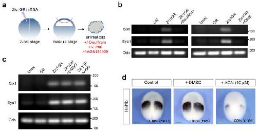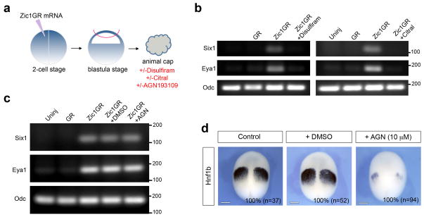 Figure 6. Zic1 regulates placode fate independently of canonical RA receptors(a) Animal explants dissected from embryos injected in one blastomere at the 2-cell stage with Zic1GR mRNA and cultured for 8 hours in dexamethasone, with or without the pharmacological inhibitors Disulfiram (100 μM), Citral (100 μM) or AGN193109 (10 μM). (b) RT-PCR analysis of Six1 and Eya1 expression in animal explants expressing Zic1GR treated with Disulfiram or Citral. Odc (Ornithine decarboxylase) is shown as a loading control. Controls are uninjected (Uninj) and GR mRNA injected (GR) animal explants. Similar results were obtained in four independent experiments for each inhibitor. The position of markers of known size is indicated (bp). (c) RT-PCR analysis of Six1 and Eya1 expression in Zic1GR injected animal explants treated with the pan-RAR antagonist, AGN193109. Controls are uninjected (Uninj), GR mRNA injected (GR) and Zic1GR mRNA injected treated with DMSO (+DMSO) animal explants. Similar results were obtained in six independent experiments. The position of markers of known size is indicated (bp). (d) AGN193109 treatment blocks Hnf1b expression in the posterior hindbrain (100% of the embryos; n=94), while in DMSO-treated embryos Hnf1b expression is similar to that of control embryos (100% of the embryos; n=52 and n=37, respectively). Three independent experiments were performed. Stage 13 embryos, dorsal views, anterior to top. Scale bars, 200 μm. |