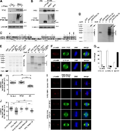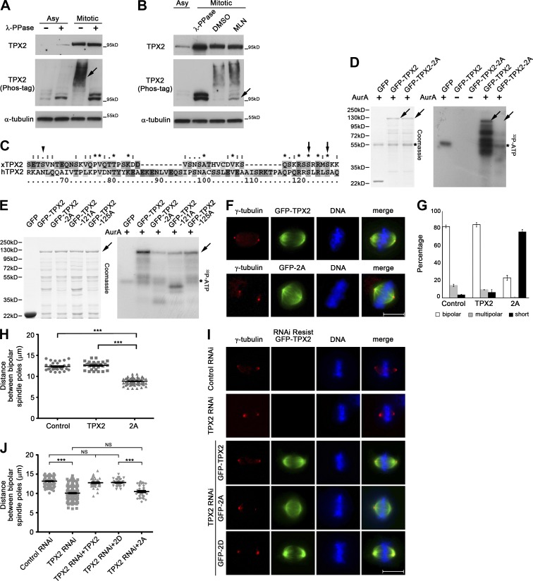 Figure 1. TPX2 phosphorylation by Aurora A is required for normal spindle length. (A) Asynchronous or mitotic HeLa cell lysates were treated with λ-phosphatase. In the middle panel, Mn2+-phos-tag was introduced into the gel to enhance mobility shifts of phosphorylated TPX2. The majority of TPX2 is phosphorylated during mitosis (arrow). (B) Mitotic cell lysates were treated with λ-phosphatase, DMSO, or Aurora A inhibitor MLN8237 (MLN), and asynchronous cell lysate was left untreated (left lane). Nonphosphorylated TPX2 accumulates after Aurora A inhibition (arrow) compared with DMSO treatment. (C) Protein sequences of Human and Xenopus TPX2 were aligned by ClustalW and potential phosphorylation sites by Aurora A are indicated with arrows (conserved in both sequences) or an arrowhead (unique to Xenopus TPX2). Asterisks indicate positions that have identical residues on both sequences, double dots indicate highly conserved residues, and single dots indicate weakly conserved groups. (D and E) In vitro kinase assay using recombinant TPX2 as substrate. Phosphorylation of TPX2 is abolished after double serine-to-alanine mutation, and both S121 and S125 contribute to the phosphorylation. TPX2 is indicated by arrows and Aurora A by asterisks. (F–H) HeLa cells were transfected with GFP-TPX2 or -2A. Note that GFP-2A causes short bipolar spindles. Bar, 10 µm. 400 cells from three independent experiments were measured in G, and error bars indicate SD. Three independent experiments were performed in H: n = 30, 30, and 76. Error bars indicate SEM; ***, P < 0.001. (I and J) Isogenic stable HeLa cell lines were depleted of endogenous TPX2 and induced to express RNAi-resistant GFP-TPX2-WT, -2A, and -2D for 48 h. The distance between bipolar spindle poles was measured. Whereas WT- and 2D-expressing cells assemble spindles with normal length, 2A expression causes shorter bipolar spindles. Three independent experiments were performed in J: n = 126, 145, 39, 39, and 35. Error bars indicate SEM. ***, P < 0.001.