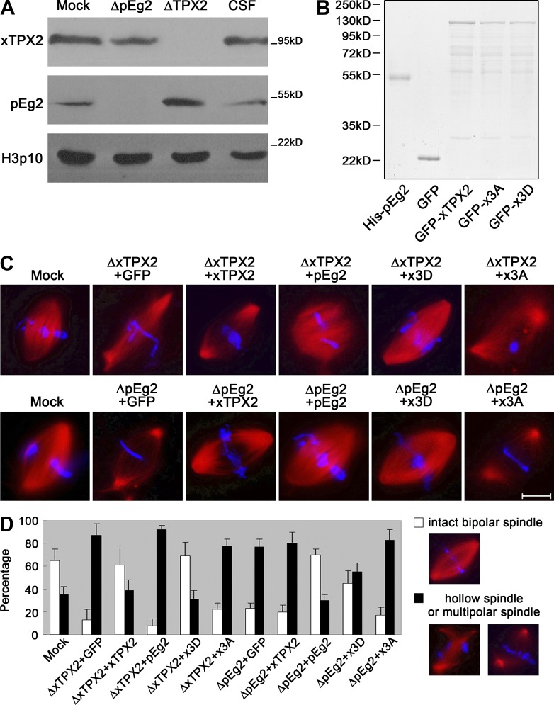 Figure 5. TPX2 phosphorylation by Aurora A is required for intact bipolar spindle assembly in mitotic Xenopus egg extract. (A) Mitotic extracts (CSF) depleted of pEg2 (Aurora A) or xTPX2 were subjected to Western blotting. Histone H3 Serine10 phosphorylation serves as a mitotic marker. (B) Coomassie blue staining showing the recombinant proteins added in C. (C and D) CSF depleted of xTPX2 or pEg2 was added with indicated proteins. Sperm-induced bipolar spindle formation was impaired by xTPX2 or pEg2 depletion. Among all proteins to rescue such defects, GFP-xTPX2-3D showed the best effect, whereas GFP and GFP-xTPX2-3A showed no rescue. GFP-xTPX2 could partially rescue xTPX2 but not pEg2 depletion; His-pEg2 could rescue pEg2 but not xTPX2 depletion. Bar, 20 µm. Three independent experiments were performed in D, each measuring 100 spindles. Error bars indicate SD.