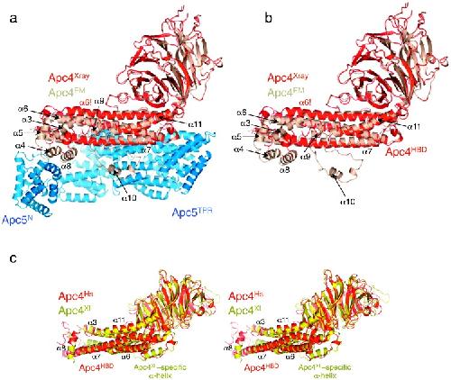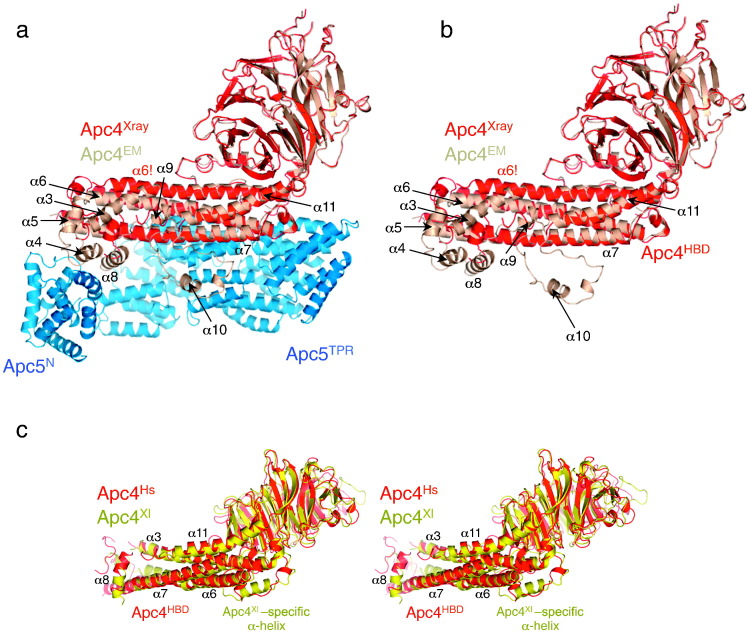 Fig. 2. The Apc4–Apc5 protein interface orders regions of Apc4HBD. (a) Human Apc4–Apc5 as organized in the APC/C with the X-ray structure of Apc4 (red) superimposed onto the EM coordinates (brown). The Apc4–Apc5 interface is shown. (b) As in (a) but without Apc5. (c) Stereoview showing that the crystal structures of X. laevis and human Apc4 are very similar (RMSD is 2.1 Å).