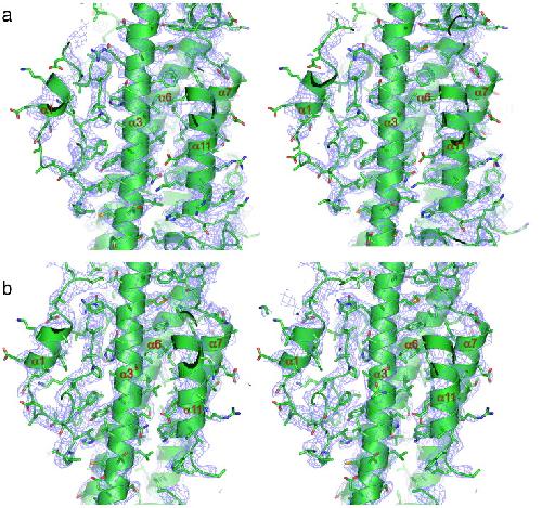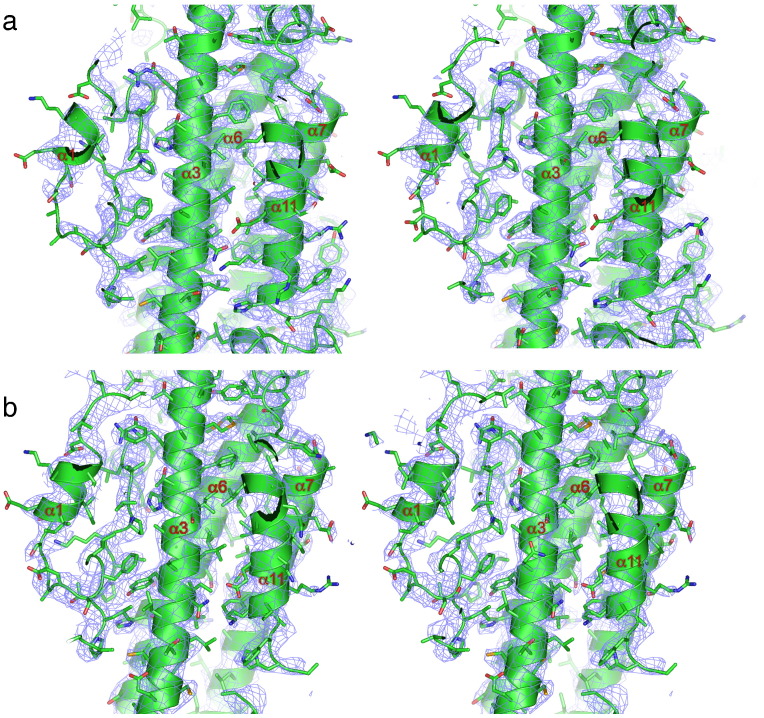 Fig. 4. Comparison of EM density maps of APC/CCdh1.Emi1 and crystal structure 2Fo − Fc maps of human Apc4HBD. (a) Stereoview of the EM density map and Apc4 coordinates. Main chain is shown as a cartoon, and amino acid side chains are shown as sticks. (b) Stereoview of the 2Fo − Fc density map contoured at 1σ and Apc4 coordinates. Main chain is shown as a cartoon, and amino acid side chains are shown as sticks.