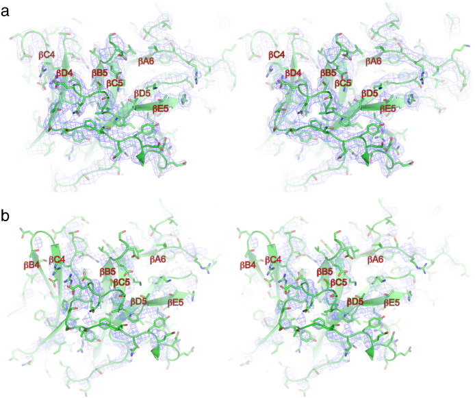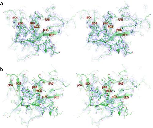 Fig. 5. Comparison of EM density maps of APC/CCdh1.Emi1 and crystal structure 2Fo − Fc maps of human Apc4WD40. (a) Stereoview of the 2Fo − Fc density map contoured at 1σ and Apc4 coordinates. Main chain is shown as a cartoon, and amino acid side chains are shown as sticks. (b) Stereoview of the EM density map and Apc4 coordinates. Main chain is shown as a cartoon, and amino acid side chains are shown as sticks.