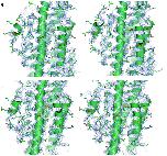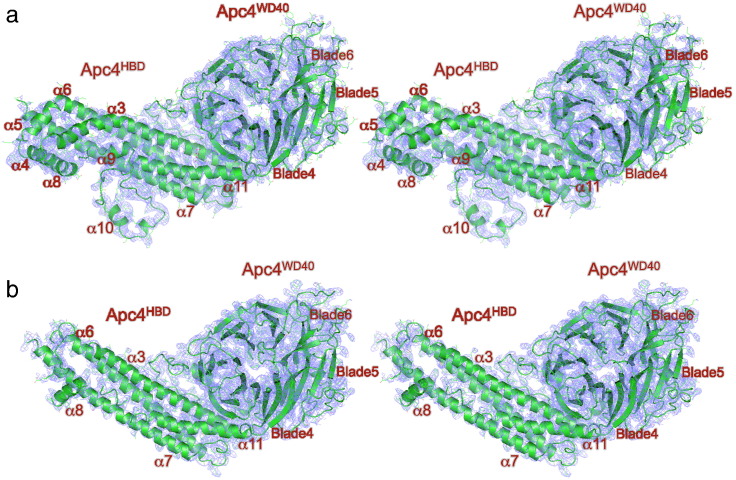 Fig. 3. Comparison of EM density maps of APC/CCdh1.Emi1 and crystal structure 2Fo − Fc maps of human Apc4. (a) Stereoview of the EM density map and Apc4 coordinates. Main chain is shown as a cartoon. (b) Stereoview of the 2Fo − Fc density map contoured at 1σ and Apc4 coordinates. Main chain is shown as a cartoon.