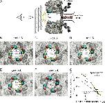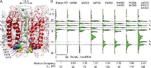 Figure 5. Pore occupancy is modified by charge addition along the permeation pathway. (A) A snapshot of the Shaker pore structure and scheme of occupancy analysis. Shaker protein, shown in light pink, was modeled using the crystallographic structure of Kv1.2 channel as a template (PDB accession no. 2A79; Moscoso et al., 2012). Segments S5–S6, forming the pore domain, are the red ribbons; K+ are green spheres; lipids are in light gray in surf representation; and residues 471, 475, 476, and 479 are represented as gray, green, blue, and yellow bumps, respectively. The front and back subunits were removed for clarity. The discontinuous lines schematize the 5-Å-radius, pore-concentric cylinder in which time-averaged ion densities were calculated in 0.5-Å-thick slices. (B) Occupancy profile for Shaker-WT, V476D, S479D, A471D, P475D, P475D/V476D, P475D/S479D, and A471D/P475D/S479D calculated by the time-averaged ion densities inside the pore-concentric, 5-Å-radius cylinder relative to the bulk solution (500 mM K+) during ∼10 ns of simulation. Discontinuous lines indicate the binding sites at z of ∼14, ∼11, ∼8, ∼5, ∼2, approximately −9, approximately −15, and approximately −19 Å for s0, s1, s2, s3, s4, s5, s6, and s7, respectively. The drawing in A and B is at approximately the same Z-scale. |