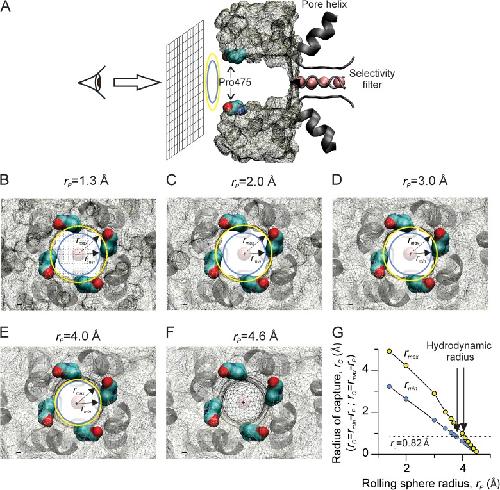 Figure 6. K+ ion hydrodynamic radius. (A) Schematic lateral view of Kv1.2/2.1 paddle chimera structure (PDB accession no. 2R9R) along the pore. The front and back subunits, together with the voltage sensor and T1 domains, were omitted. A schematic representation of the selectivity filter together with two of the pore helices and two Pro475 residues is shown for reference. Also a scheme of the 1 × 1–Å grid and the circles described by rmin and rmax are shown in blue and yellow, respectively. The eye and the arrow drawings indicate the point of view for the following images. (B–E) Surfaces left by rolling a sphere of variable radius onto the van der Waals surface of the protein. Radii varied from 1.3 to 4.6 Å (indicated in each panel). For reference, B also shows the 1 × 1–Å grid used to measure the radii rmin and rmax (represented in blue and yellow, respectively). As the size of the probe increased, the surface left by the probe was less grainy; also, the difference between the two radii decreased. When rC was ≥4.6 Å (F), the probe was not able to enter the pore. (G) Effective radii of capture, rC, for rmin and rmax plotted versus rP, the radius of the probe. The size of the hydrodynamic radius for K+ ion was obtained when rC matched the experimentally obtained capture radius of 0.82 Å (dashed line). The values for the K+ ion hydrodynamic radius were 3.8 and 4.1 Å for the comparison with the smaller and the bigger circle data, respectively (vertical arrows). |