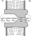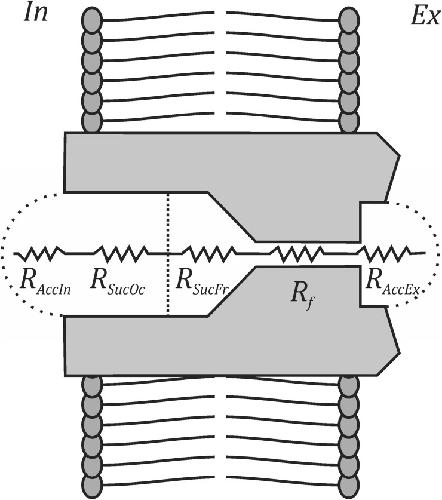 Figure 7. In-series connected resistance model. The conduction pathway was divided into five resistors connected in-series: the external and internal access resistances, RAccIn and RAccEx, respectively; the resistance of the section occupied by sucrose, RSucOc; the resistance of the sucrose-free section, RSucFr; and the selectivity filter, Rf. See Table 2 for details of resistance calculations. |