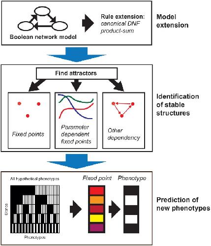 Fig 1. Phenotype analysis using the Boolean Network Extension (BNE).The application of the BNE to a given Boolean network (BN) can be divided into three basic steps: Model extension (top), identification of stable structures (middle) and mapping to phenotypes (bottom). In the model extension step (top) the rules of the BN are transformed to the rules of the BNE by converting the rules of the BN to canonical disjunctive normal form (DNF) and then to product-sum fuzzy logic (DNF product-sum extension, details see section Extension of Boolean networks). In the âidentification of stable structuresâ-step (middle) the extended BNE is simulated for a large number of random inputs. The resulting approximated attractors can either be fixed points approximated by point clouds, fixed points depending on one or multiple parameters or different dependencies. Finally, new phenotypes are identified step (bottom) by mapping the fixed points to their nearest hypothetical phenotype.