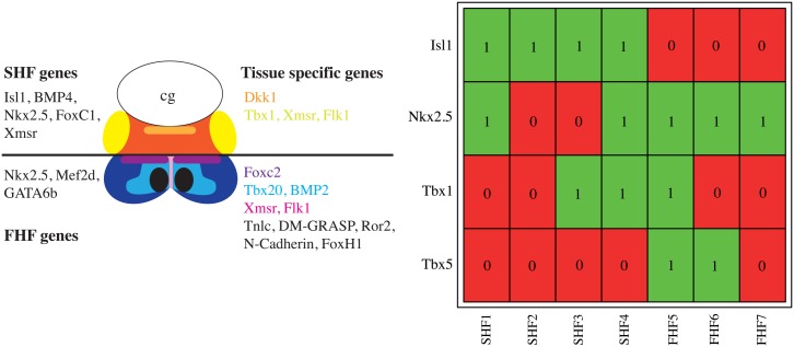 Fig 3. Schematic drawing of cardiac tissue in Xenopus laevis at stage 24—Expression of genes in heart fields (left) and RT–PCR analysis of selected genes (right).Panels adapted from Gessert and Kühl [19]. The left panel shows the genes expressed in different domains of the first heart field (FHF) and second heart field (SHF). The SHF is shown at the top and the FHF is shown at the bottom. Common genes expressed in all regions of the FHF and SHF, respectively, are shown on the left. Genes expressed in particular domains are shown on the right. Colors indicate different domains and corresponding expressed genes. The right figure shows the results of single cell RT–PCR analysis of gene expression for the four genes Nkx2.5, Isl1, Tbx1, and Tbx5. Values (0 and 1) and colors red/green represent inactive or active genes. The panel shows the gene expression of different single cell samples (numbered and named at the bottom). FHF and SHF are distinguished by the expression of the Isl1.