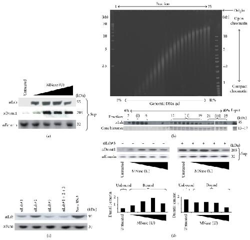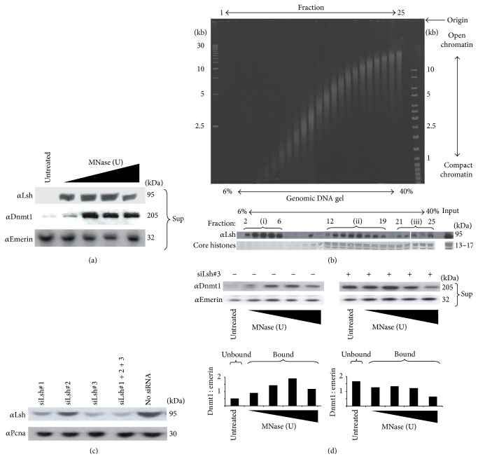 Eukaryotic genomes are methylated at cytosine bases in the context of CpG dinucleotides, a pattern which is maintained through cell division by the DNA methyltransferase Dnmt1. Dramatic methylation losses are observed in plant and mouse cells lacking Lsh (lymphoid specific helicase), predominantly at repetitive sequences and gene promoters. However, the mechanism by which Lsh contributes to the maintenance of DNA methylation is unknown. Here we show that DNA methylation is lost in Lsh depleted frog and fish embryos, both of which exhibit developmental delay. Additionally, we show that both Lsh and Dnmt1 are associated with chromatin and that Lsh knockdown leads to a decreased Dnmt1-chromatin association. Coimmunoprecipitation experiments reveal that Lsh and Dnmt1 are found in the same protein complex, and pulldowns show this interaction is direct. Our data indicate that Lsh is usually diffuse in the nucleus but can be recruited to heterochromatin in a HP1α-dependent manner. These data together (a) show that the role of Lsh in DNA methylation is conserved in plants, amphibian, fish, and mice and (b) support a model in which Lsh contributes to Dnmt1 binding to chromatin, explaining how its loss can potentially lead to perturbations in DNA methylation maintenance.