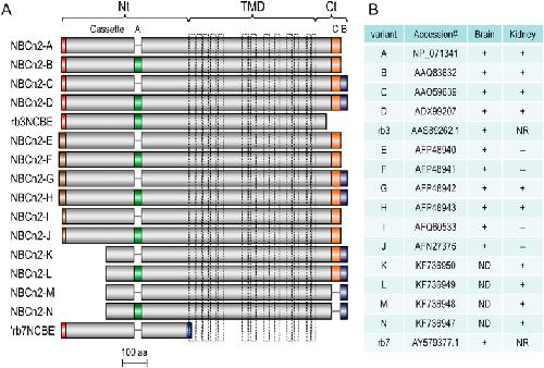 Liu, Cloning and functional characterization of novel variants and tissue-specific expression of alternative amino and carboxyl termini of products of slc4a10. 2013, Pubmed , Xenbase