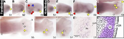 Sulf2 expression in X. laevis stage 51â53 forelimbs (AâC) and stage 50â57 hindlimbs (DâJ) examined by a whole mount in situ hybridization. Specific staining is dark purple. Red arrows in the more proximal part indicate gene expression at the putative shoulder/hip and elbow/knee joints; blue arrows indicate expression at the future wrist/ankle joints; yellow arrows indicate transcript expression in the autopod region; empty arrows indicate reduced level of expression. Roman numerals indicate digit number. The boxed region in E indicates area of histological section shown in Eâ², accompanied by the corresponding schematic (Eâ²) showing area of gene expression in the mesenchyme. All limbs are oriented proximal to the left and posterior uppermost, with the tadpoles lying on their right side. AER, apical epidermal ridge; m, mesenchyme.