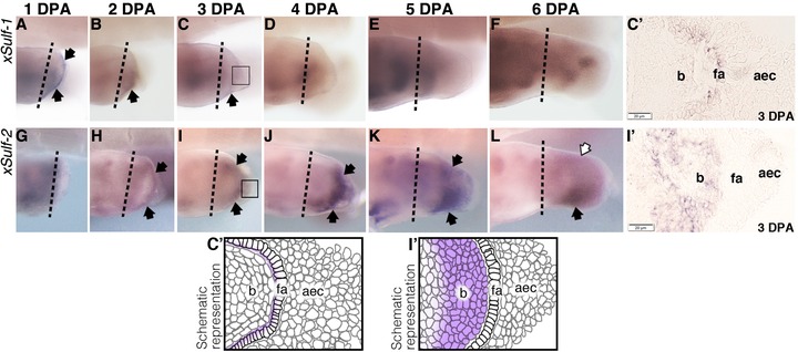 X. laevis sulf1 (AâF) and sulf2 (GâL) expression in regenerating hindlimbs originally operated at developmental stage 52 examined by a whole mount in situ hybridization. Specific staining is dark purple. Black arrows point to regions of transcript expression that is specific to regeneration; empty arrows indicate reduced level of expression. The original site of amputation is indicated by the black dotted line. Boxed region in C and I indicate area of histological section as shown in Câ² and Iâ² respectively, accompanied by their respective schematics. All limbs are oriented proximal to the left and posterior uppermost, with the tadpoles lying on their right side. aec, apical epidermal cap; fa, functional aec; b, blastema.