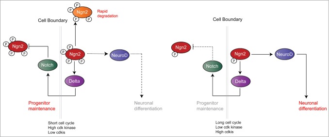 Figure 2. Model illustrating why phosphorylated Ngn2, found when cdk kinase levels are high, favors progenitor maintenance. Conversely, dephosphorylation of Ngn2 that occurs when cdk levels drop and cdk inhibitors increase, favors differentiation. Taken from ref.7
