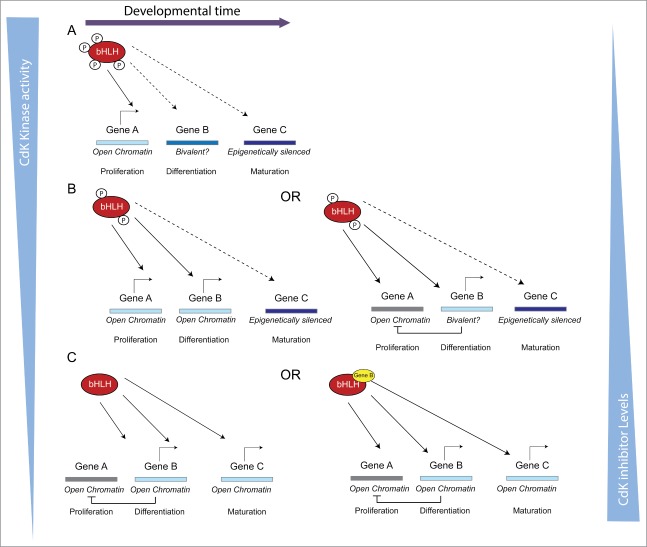 Figure 3. Model illustrating how changing promoter dwell time by bHLH transcription factors by altering their phospho-status would have differing effects on promoter activation depending on their epigenetic availability (described in more detail in the text).