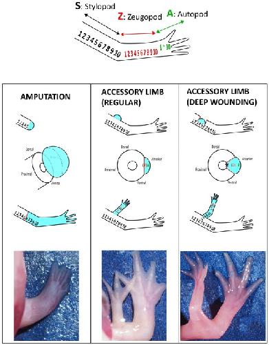 Figure 2. Proximal−distal reorganization in the ALM. Top: Conceptual positional values. S, stylopod; Z, zeugopod; A, autopod. Numbers 1−10 are assigned from proximal to distal. Left column: Regeneration in an amputated limb. Stylopod is amputated at the S5 position and S6−10 are restored by a regular limb regeneration process. Middle column: Accessory limb induction in a stylopod region. Basically the limb surface (skin) is damaged and a blastema is induced on the surface of the limb. A blastema acquires A+Z values, resulting in lower limb formation. Right column: An accessory limb with half stylopod. Wounding reaches a stylopod bone and a blastema is induced on the damaged bone. The induced blastema contains S6−10 values and regenerates an accessory limb with half stylopod.