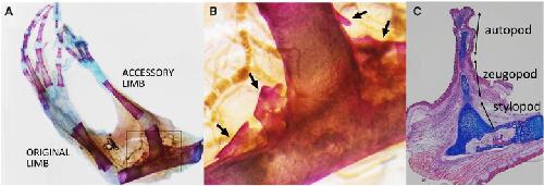 Figure 1. Accessory limb formation in axolotls. (A) A typical phenotype of accessory limb induction in the stylopod. (A, insets) Accessory limb induction in the zeugopod region. Autopod part was induced. Right is the Alcian Blue staining to visualize the skeletal pattern. (B) Cartilage was visualized by Alcian Blue and calcified bone was visualized by Alizarin Red. Auto., autopod; Zeug., zeugopod; Styl., stylopod.