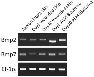 Figure 4. Blastema expresses Bmp2 and Bmp7. Bmp2 and Bmp7 expression was investigated by reverse transcription polymerase chain reaction (PCR). Ef‐1a is an internal control. Samples were prepared as indicated. PCR was performed by Takara ExTaq. The number of PCR cycles is 30.