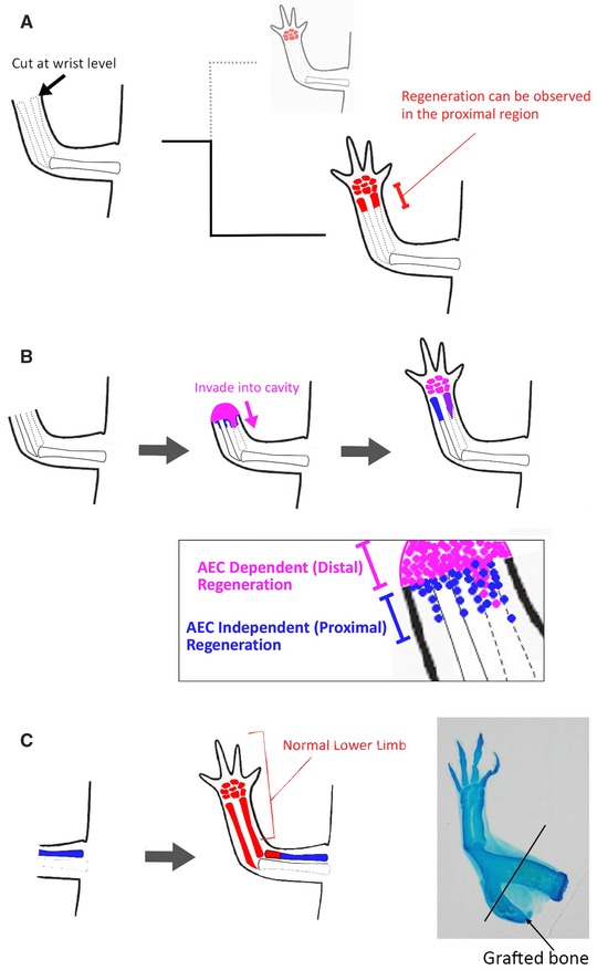 Figure 5. An interpretation of previous experimental results. The illustration is drawn on the basis of the results reported by Goss (1956). (A) Both ulna and radius were removed and the limb was amputated at the wrist level. Because amputation was achieved at the wrist level, only autopodial elements should have been regenerated in theory. However, partial zeugopodial regeneration took place. (B) An interpretation of Goss's experiment. The ulna was extirpated and the limb was amputated. A partial ulna was regenerated. The experiment in (A) suggests that blastema cells can invade into a cavity and participate in proximal regeneration. Therefore, it is likely that blastema cells invade into a cavity and regenerate partial ulna. (C) An ulna was added to the stylopod and the limb was amputated. The added ulna was regenerated but distal parts showed a normal skeletal pattern without any duplicated skeletal elements. When a humerus was engrafted, the same phenotype was obtained (inset). The humerus was grafted as indicated in Goss (1956). The regenerated humerus was fused to the other. This fusion was also reported by Goss (1956). The regenerated distal parts were normal (n = 4/4).