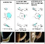 Figure 6. Xenopus limb regeneration and ectopic blastema formation. Left column: Regeneration in an amputated limb. Stylopod is amputated at the S5 position. Hypomorphic structure, called a spike, is induced. Middle column: Accessory blastema induction in a stylopod region. All nerve bundles are rerouted to the skin wound, leading to an ectopic blastema formation. However, the induced blastema cannot keep growing and shrinks at last (inset). Right column: An accessory spike formation. Wounding reaches a stylopod bone and a blastema is induced on the damaged bone. The induced blastema forms a cartilaginous spike. In the picture spike and blastema are induced in the posterior region, not the anterior region, for experimental reasons.