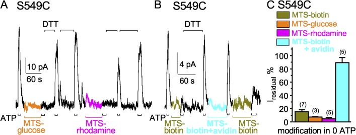 Cysteine accessibility probes timing and extent of NBD separation along the dimer interface in gating CFTR channels.