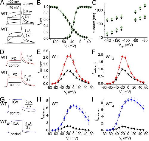 Figure 1. Concatenated tetrameric hERG1 (WT4) channels have similar biophysical and pharmacological properties as channels formed by coassembly of single WT hERG1 subunits. (A) Representative WT and WT4 hERG1 channel currents recorded at the indicated Vt (−70 to 30 mV stepped in 20-mV increments). (B) The voltage dependence of WT channel gating (upright green triangles, activation; sideways green triangles, C-type inactivation) is similar to WT4 channels (upside-down black triangles, activation [n = 6]; sideways black triangles, C-type inactivation [n = 8]). Data were fitted to Boltzmann function (smooth curves) to determine V0.5act and z values (presented in Table 1). (C) Time constants (τ deact) for fast and slow components of current deactivation for WT (green triangles, n = 10) and WT4 (black triangles, n = 11) channels at the indicated return potential (Vret). (D) Effect of 10 µM PD on WT and WT4 hERG1 channel currents elicited by 4-s step to 0 mV. Itail was measured at −70 mV. (E and F) Itest-Vt relationships in the absence (black triangles) and presence of 10 µM PD (red triangles) for oocytes injected with cRNA encoding single WT subunits (E, n = 10) or WT4 channels (F, n = 7). Currents were normalized to peak Itest (at −20 mV) measured under control conditions. (G) Effect of 10 µM ICA on currents for WT and WT4 channels. (H and I) Itest-Vt relationships in the absence (black triangles) and presence of 10 µM ICA (blue triangles) for oocytes injected with cRNA encoding single WT subunits (H, n = 5) or WT4 channels (I, n = 10). Data are expressed as mean ± SEM (n = number of oocytes).