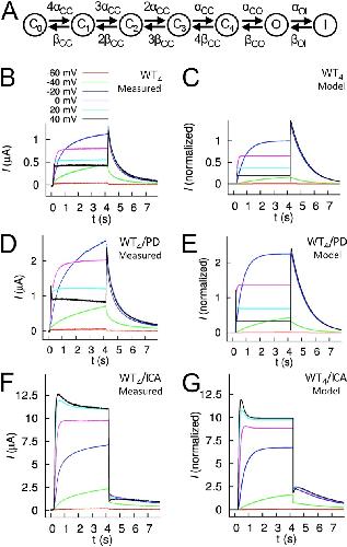 Figure 2. Markov modeling of hERG1 tetrameric channel currents modified by drugs PD and ICA. (A) The model comprises seven states (C0,…,C4, closed states; O, open state; I, inactivated state) coupled with the indicated rate coefficients. (B) Averaged currents (n = 4) from oocytes expressing WT4 tetramers under control conditions in response to voltage steps to the indicated Vt. (C) Simulated currents for WT4 tetramers under control conditions. (D and E) Averaged currents measured from the same oocytes as in B, after application of 30 µM PD (D), and corresponding simulated currents (E). (F and G) Averaged currents (n = 6) measured after application of 30 µM ICA (F) and corresponding simulated currents (G). Currents shown in B, D, and F were not leak subtracted.