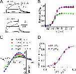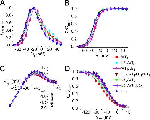 Figure 3. Biophysical properties of concatenated LEn/WT4−n tetrameric hERG1 channels. (A) Itest-Vt relationships. (B) Voltage dependence of activation. (C) Fully activated Itail-Vret relationships. (D) Voltage dependence of inactivation. Legend refers to all panels. Data are expressed as mean ± SEM (n = 5–12; values for V0.5 and z for activation and inactivation are presented in Table 1; n = number of oocytes).