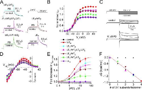 Figure 4. PD-induced enhancement of hERG1 current indicates cooperative subunit interactions. (A) Representative current traces recorded at 0 mV for concatenated tetramers containing zero to three WT subunits together with one to four L646E subunits, before and after 10 µM PD. (B) Effect of 10 µM PD on voltage dependence of channel activation. Itail was measured at −70 mV after pulses to the indicated Vt and normalized to Itail-max under control conditions for each channel type (n = 7–15). The symbol legend between B and E refers to data plotted in B and D–F. Control Itail-Vt relationship (black pentagons) overlaps data for LE4 channels and represents the mean of all channel types. The V0.5act and z values obtained from fitting Itail-Vt relationships to a Boltzmann function (smooth curves) before and after 10 µM PD are presented in Table 1. (C) Pulse protocol (top) used to measure fully activated Itail-Vret relationship and representative currents for WT4 channels under control conditions and after 10 µM PD as indicated. (D) Effect of 10 µM PD on Itail-Vret relationships (n = 4–9) normalized to Itail at −120 mV under control conditions for LEn/WT4−n tetramers (n = 0–4). (E) [PD]-response relationships for fold increase in Itail-max at −70 mV for different tetramers according to symbol legend shown between B and E. Data were fitted with a logistic equation to determine EC50 values and Hill coefficient, nH (see Fig. 5). (F) Plot of ΔG versus number of WT subunits contained in a concatenated tetramer. ΔG was equal to −RTlnKeq, where Keq was defined as Po/(1 − Po) at maximal effect of PD and assuming maximum Po in the absence of drug to be 0.5. Linear regression analysis was used to fit calculated data (colored symbols; solid line: y = −0.39x + 0.058; R2 = 0.96) and the relationships predicted for independent subunit transitions (▾) and cooperative subunit interactions, models 1 (▴) and 2 (•). Data are expressed as mean ± SEM (n = number of oocytes).