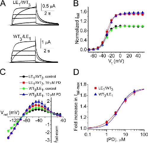 Figure 6. Positioning of a single LE mutant subunit in a concatenated hERG1 tetramer does not affect biophysical properties or response to PD. (A) Representative current traces for LE1/WT3 and WT3/LE1 hERG1 channels. Pulses were applied to Vt of −70 to 30 mV in 20-mV increments. Vh was −80 mV and Vret was −70 mV. (B) Normalized Itail-Vt relationships before and after 10 µM PD. Symbol legend is the same as for C. For LE1/WT3 hERG1 channels: V0.5act = −32.1 ± 1.3 mV, z = 4.13 ± 0.14 mV (control); V0.5act = −30.1 ± 1.6 mV, z = 4.20 ± 0.07 mV (PD; n = 11). For WT3/LE1 hERG1 channels: V0.5act = −29.1 ± 1.5 mV, z = 3.36 ± 0.21 mV (control); V0.5act = −27.1 ± 1.3 mV, z = 3.44 ± 0.16 mV (PD; n = 4). (C) Normalized fully activated Itail-Vret relationships determined before and after 10 µM PD. (D) [PD]-response relationships for LE1/WT3 hERG1 channels (EC50 = 4.6 µM, nH = 1.1; n = 6–9) and WT3/LE1 hERG channels (EC50 = 4.8 µM, nH = 1.4; n = 4). Data are expressed as mean ± SEM (n = number of oocytes).
