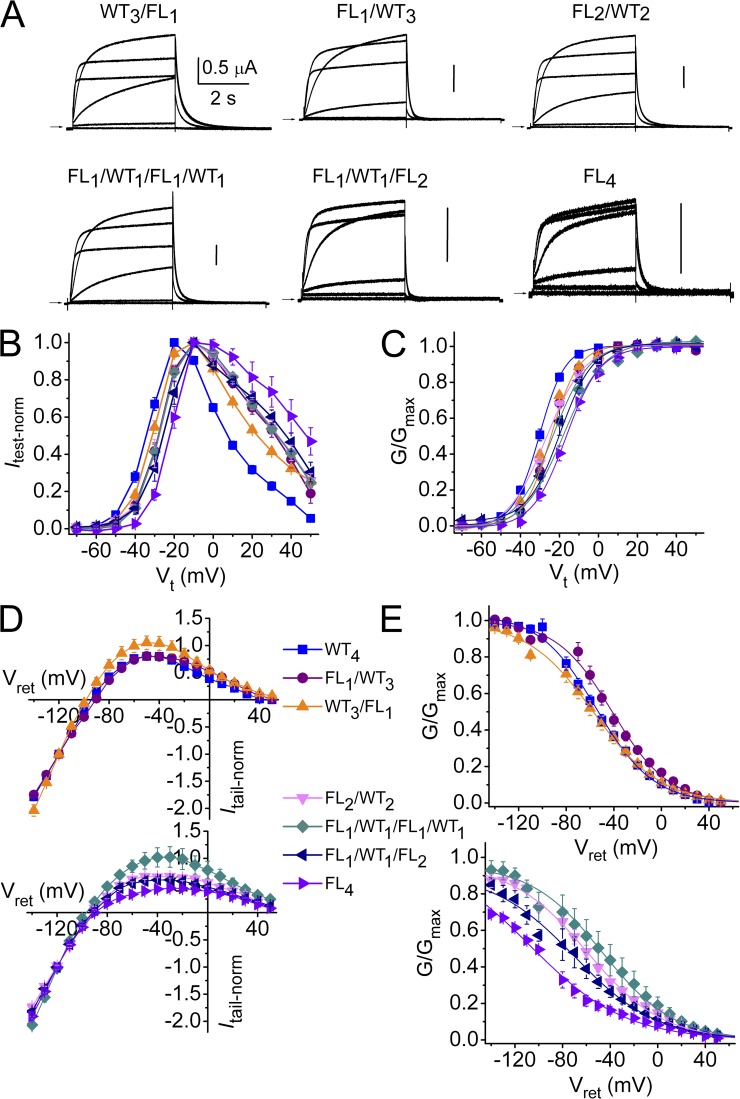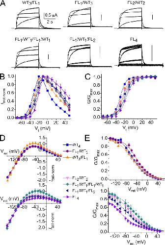 Figure 7. Biophysical properties of concatenated FLn/WT4−n tetrameric hERG1 channels. (A) Representative current traces for concatenated tetramers containing zero to three WT subunits together with one to four F557L subunits. Pulses were applied to Vt of −70 to 30 mV in 20-mV increments. Vh was −80 mV and Vret was −70 mV. (B) Itest-Vt relationships for FLn/WT4−n tetrameric hERG1 channels. (C) Voltage dependence of activation. (D) Fully activated Itail-Vret relationships. (E) Voltage dependence of inactivation. The symbol legend refers to B–E. Data are expressed as mean ± SEM (n = 3–12). Values for V0.5 and z for activation and inactivation are presented in Table S2.
