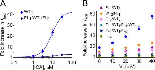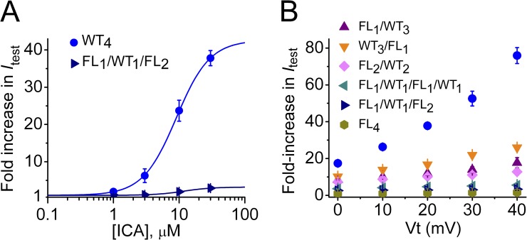 Figure 8. Concentration- and voltage-dependent effects of ICA on Itest. (A) Concentration-dependent increase in Itest measured at 20 mV by ICA for WT4 and FL1/WT1/FL2 hERG1 concatenated channels. Data were fitted with a logistic equation (smooth curves). For WT4 channels: EC50 = 9.1 µM, nH = 1.7 (n = 6–9); for FL1/WT1/FL2 channels: EC50 = 11.8 µM, nH = 2.0 (n = 6–10). (B) Fold increase in Itest by 30 µM ICA as a function of Vt (n = 3–8). Data are expressed as mean ± SEM (n = number of oocytes).