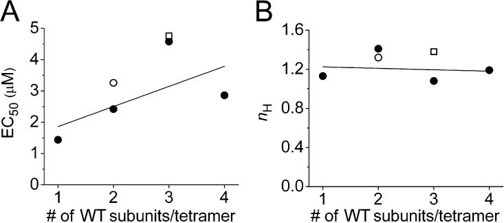 Figure 5. The concentration response relationship for PD-induced increase in Itail is not dependent on the number of WT subunits in a concatenated tetramer. (A) Plot of EC50 as a function of the number of WT subunits in a tetramer. Line represents linear fit to data: y = 0.64x + 1.22 (adjusted R2 = 0.099). (B) Plot of nH as a function of number of WT subunits in a tetramer. Line represents linear fit to data: y = −0.015x + 1.24 (adjusted R2 = −0.473). In both panels, the open circle represents LE1/WT1/LE1/WT1 channels; the open square represents WT3/LE1 channels.