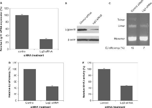 Figure 4. Down-regulation of DNA ligase III results in decreased MHEJ activity. HTD114 cells were transfected with nontargeted siRNA (control) or siRNA oligonucleotides against ligase III (siRNA 121668). Forty-eight hours after transfection, total RNA and nuclear extracts were prepared. Expression of ligase III at mRNA level and protein level was determined by quantitative real time-PCR (A) and by immunoblotting analysis (B), respectively. (C) End-joining activity affected by the reduction of ligase III. Linearized pUC18PD1/4 DNA (300 ng) was incubated with 1 μg nuclear protein extracts from HTD114 transfected with nontargeted siRNA (lane 1) or the ligase III siRNA 121668 (lane 2). (D) A summary of three independent end-joining reactions as performed in (C). (E) Quantification of MHEJ.