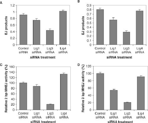 Figure 8. The involvement of DNA ligases I, III and IV in 2- and 3-bp MHEJ. End-joining reactions were carried out by incubating 300 ng linearized pUC18-2-bp-repeat (containing a 2-bp, AG repeat at each end, A) or pUC18-3-bp-repeat (containing a 3-bp, CAG repeat at each end, B) with nuclear extracts (1 μg) prepared from HTD114 cells treated with nontargeted siRNA, or siRNA against ligase I (121248), III (121668), or IV (121372). The amount of end-joined products from individual reactions was determined with a quantitative real time-PCR assay as described in Materials and methods section. The bar represents the mean end-joining efficiency of three independent reactions and the error bar is SEM. The activity of MHEJ using 2-bp (C) or 3-bp (D) microhomology was determined by multiplying the end joining efficiency (A and B) with the fraction of end-joined products mediated by 2- or 3-bp microhomology (Table 2).