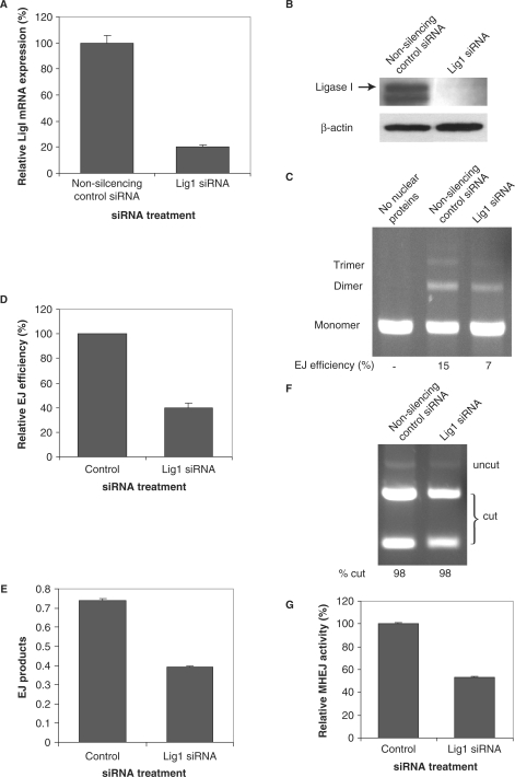 Figure 2. Down-regulation of DNA ligase I leads to reduced MHEJ activity. HTD114 cells were transfected with siRNA oligonucleotides against DNA ligase I (siRNA 121249). Forty-eight hours after transfection, total RNA and nuclear extracts were prepared. RNA samples were reverse transcribed to cDNA, followed by real time-PCR, repeated three times for each RNA sample, to determine the expression level of ligase I (A). Data represent the mean and the SEM. Nuclear extracts were analyzed by immunoblotting with the indicated antibodies (B). (C) End-joining activity affected by the depletion of Lig1. Linearized pUC18PD1/4 DNA (300 ng) was incubated without (lane 1) or with 1 μg nuclear protein extracts from HTD114 transfected with the indicated siRNA oligonucleotides (lanes 2 and 3). The end-joined products were separated by electrophoresis in an agarose gel and the efficiency of end joining was calculated as the percentage of end-joined products (dimer and multimers) in total DNA in the reaction (monomer, dimer and multimers). (D) A summary of three independent end-joining experiments performed as in C (above). Data represent the mean and SEM. (E) The amount of end-joined products from individual reactions shown in C (above) was determined, in triplicate, with a quantitative real time-PCR assay as described in Materials and methods section. The bar represents the mean and the error bar is SEM. (F) End-joined products from reactions shown in C were PCR amplified and subsequently digested with XcmI. The relative contribution of 10-bp MHEJ to DNA end joining was calculated as the percentage of the XcmI-digested fragments in total PCR products (sum of the undigested and XcmI-digested fragments). (G) Quantification of MHEJ activity. The MHEJ activity was calculated by multiplying the amount of end-joined products measured from (E) with the relative contribution of MHEJ obtained in (F).