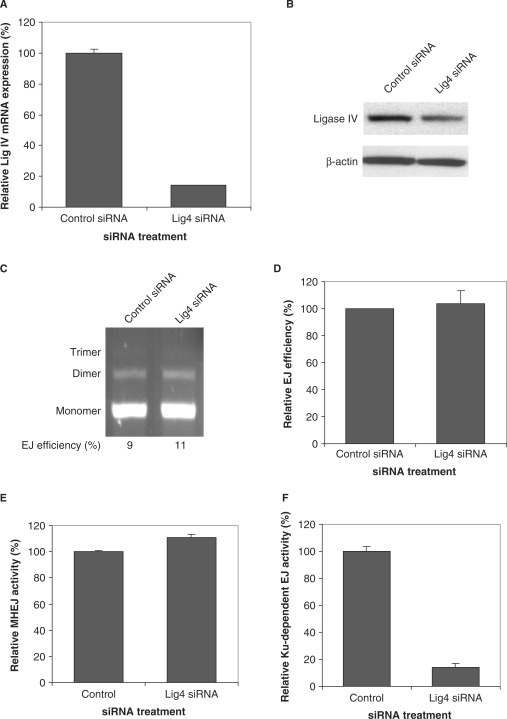 Figure 6. DNA ligase IV is not required for MHEJ. (A) siRNA-mediated down-regulation of DNA ligase IV in HTD114 cells. Expression of ligase IV at the mRNA level was determined by quantitative real time-PCR. (B) Expression of ligase IV at the protein level, as determined by the western blot assay. (C) End-joining activity in nuclear extract with reduced ligase 4. Linearized DNA substrate (300 ng) was incubated with 1 μg nuclear protein extracts from HTD114 transfected with nontargeted siRNA (lane 1) or the ligase IV siRNA 121372 (lane 2). (D) A summary of three independent end-joining reactions as performed in C. (E) Quantification of MHEJ. (F) DNA ligase IV is required for the Ku-dependent NHEJ pathway. End-joining reactions were carried out by incubating 10 ng DNA substrates with 8 μg nuclear extracts prepared from HTD114 cells treated with nontargeted siRNA, or siRNA 121372 against ligase IV. PCR products of end-joined products were digested with XcmI. The uncut band represents the Ku-dependent NHEJ pathway. NHEJ activity was calculated by multiplying the amount of end-joined products measured by real time PCR with the relative contribution of NHEJ obtained from (A).