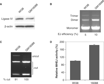 Figure 7. Mutation in the ligase IV gene leads to increased MHEJ. (A) Western blot analysis with the antibody against DNA ligase IV. (B) End-joining activities. Nuclear extract (1 μg) from GM16088 cells, which carry a mutation in ligase IV gene, was incubated with the DNA substrate (500 ng). (C) PCR products of end-joined products shown in (A) were digested with XcmI. (D) Quantification of MHEJ.