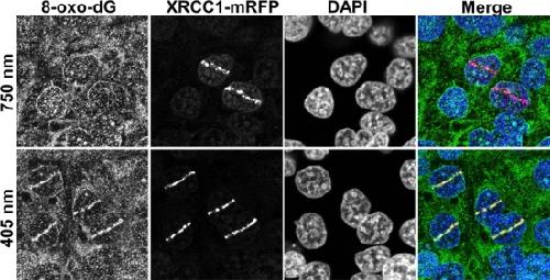 Figure 1. Comparative induction of base damage and strand breaks by different laser micro-IR conditions. Laser micro-irradiation was performed on HeLa cells using either 750-nm multi-photon excitation or a 405-nm laser diode. The production of base damage was gauged on the basis of production of 8-oxo-dG, while XRCC1 recruitment was used as a marker of strand break induction. |